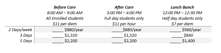 Pre-registration is required for Before Care, Lunch Bunch, and After Care. Payment for these additional services is added to tuition. The rates below are yearly and reflect 2026-2027 rates.